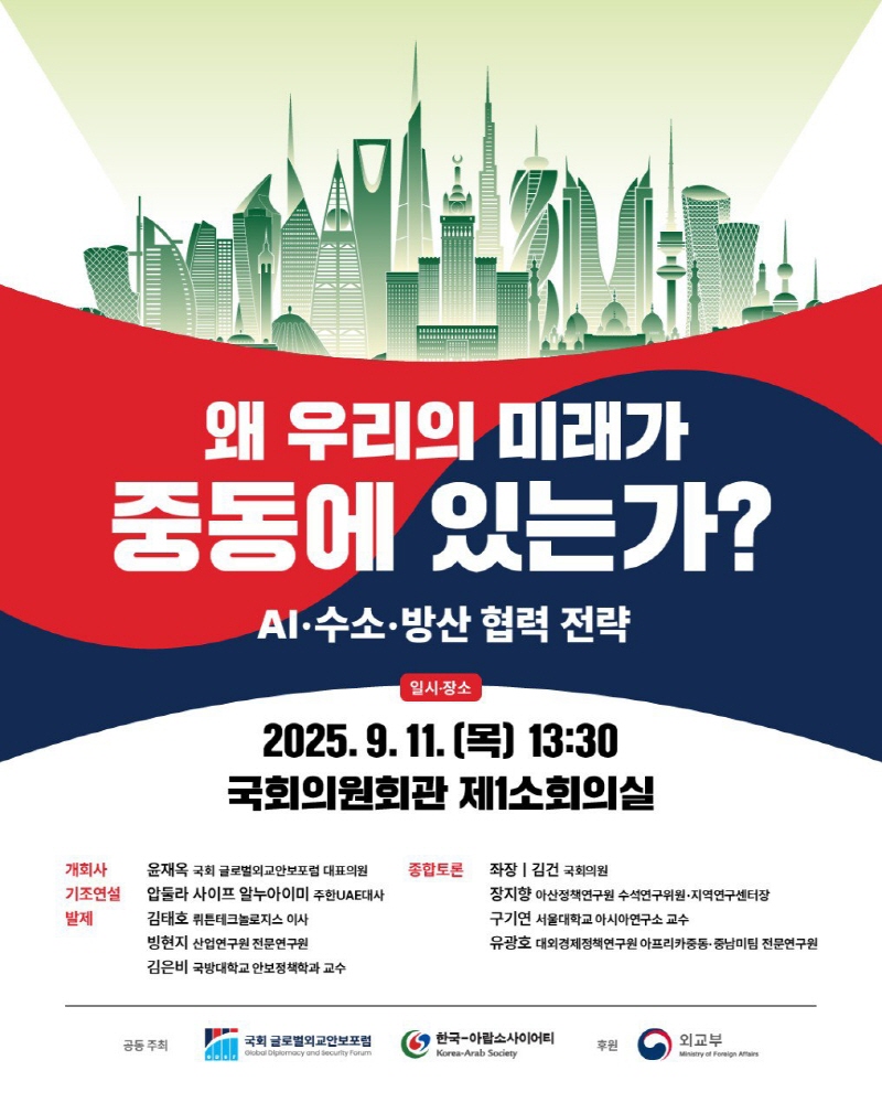 서울대학교 아시아연구소 서아시아센터의 구기연 교수가 한국·아랍소사이어티 & 국회 글로벌외교안보포럼 세미나에서 발표하였습니다. 주제는 ‘왜 우리의 미래가 중동에 있는가: AI·수소·방산 협력 전략’입니다.