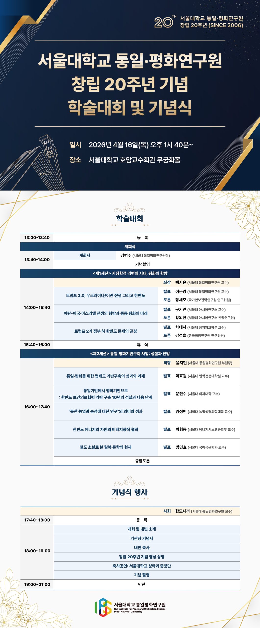 서울대학교 아시아연구소 서아시아센터의 구기연 교수와 황의현 선임연구원이 서울대학교 통일·평화연구원 창립 20주년 기념 학술대회에 각각 발표자와 토론자로 참여합니다. 주제는 ‘이란·미국·이스라엘 전쟁의 향방과 중동 평화의 미래’입니다.