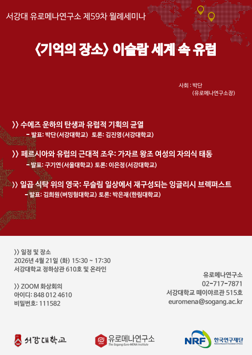 서울대학교 아시아연구소 서아시아센터의 구기연 교수가 서강대학교 유로메나연구소 제59차 월례세미나: <기억의 장소> 이슬람 세계 속 유럽에 발표자로 참여합니다. 주제는 ‘페르시아와 유럽의 근대적 조우: 가자르 왕조 여성의 자의식 태동’입니다.